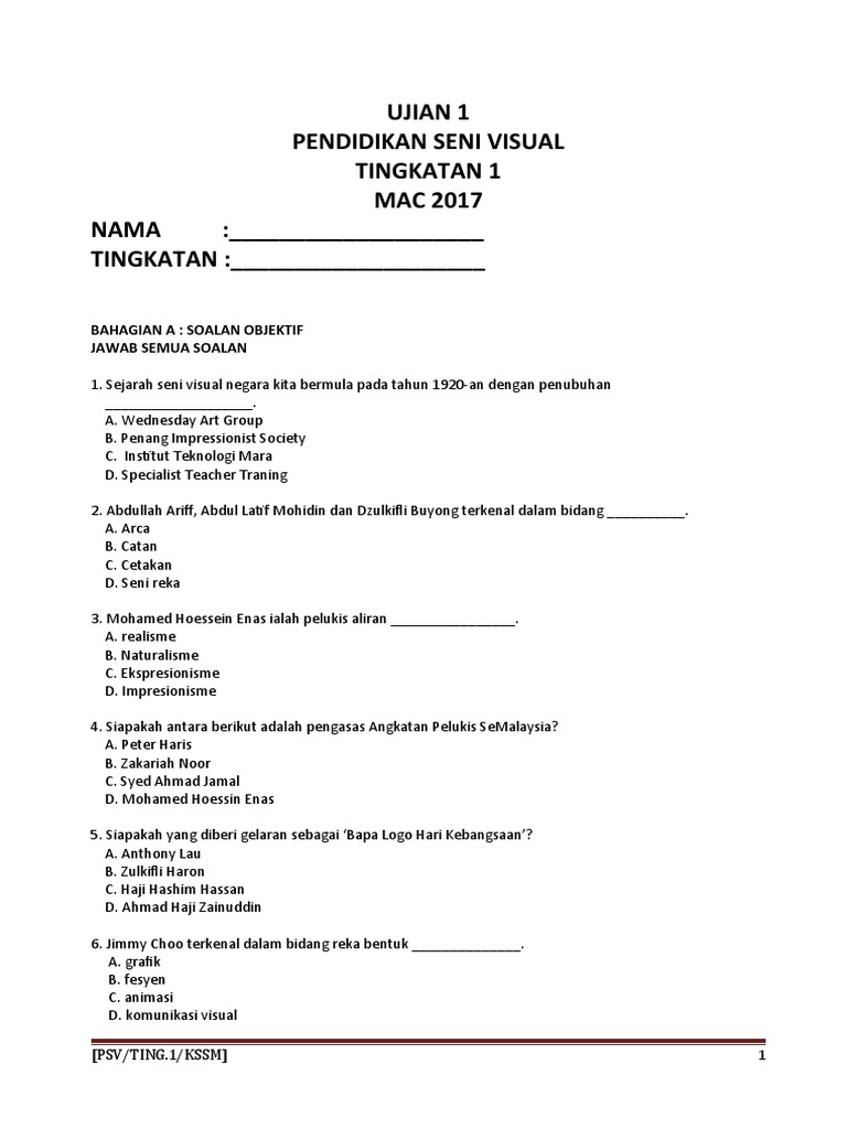 Peperiksaan Akhir Tahun 2020 Tingkatan 4 Pendidikan Seni Visual Worksheet
